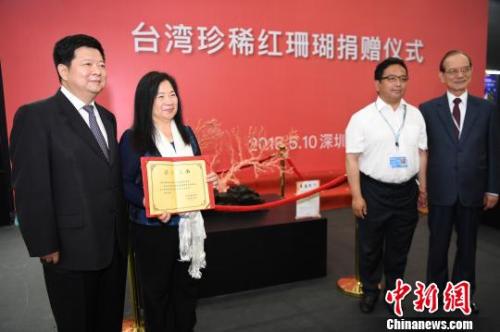 中新社深圳5月10日電 (沈釗)臺灣綺麗珊瑚有限公司董事長洪明麗10日在第十四屆深圳文博會上向北京故宮博物院和西藏布達(dá)拉宮捐贈了兩株珍貴的紅珊瑚樹,國務(wù)院臺灣事務(wù)辦公室副主任龍明彪、國民黨榮譽(yù)副主席林豐正等出席了當(dāng)天捐贈儀式。