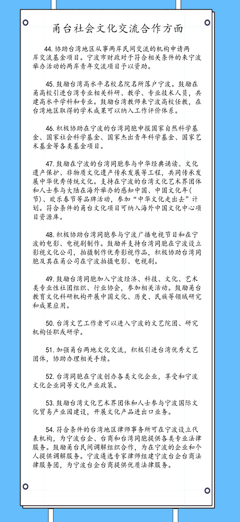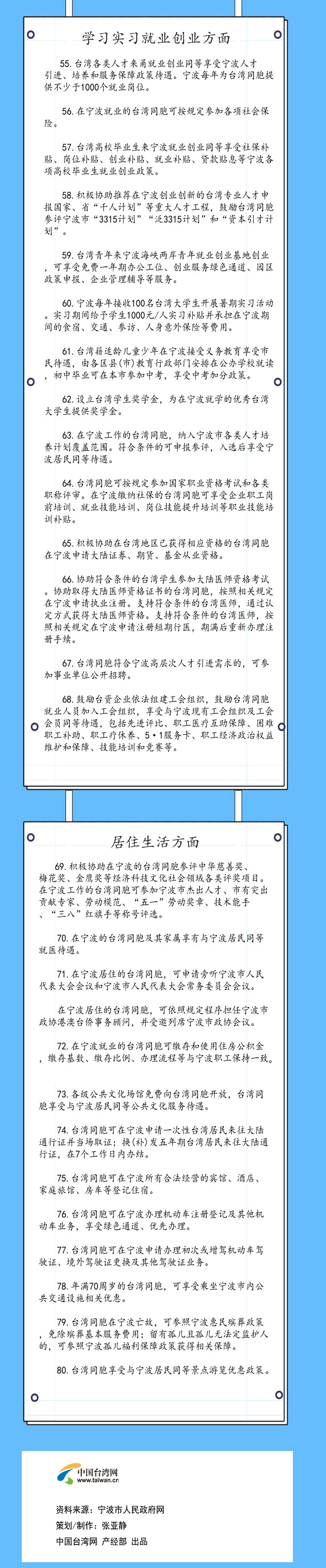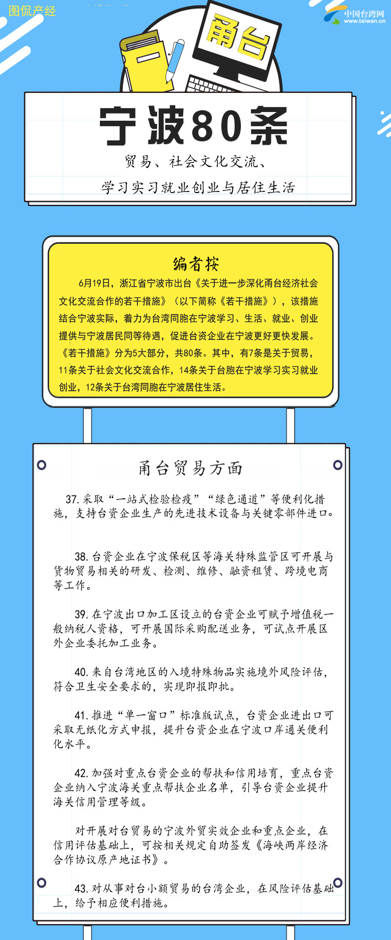 編者按:6月19日,浙江省寧波市出臺《關于進一步深化甬臺經濟社會文化交流合作的若干措施》(以下簡稱《若干措施》),該措施結合寧波實際,著力為臺灣同胞在寧波學習、生活、就業、創業提供與寧波居民同等待遇,促進臺資企業在寧波更好更快發展!度舾纱胧贩譃5大部分,共80條。其中,有7條是關于貿易,11條關于社會文化交流合作,14條關于臺胞在寧波學習實習就業創業,12條關于臺灣同胞在寧波居住生活。