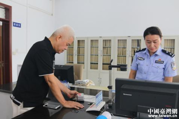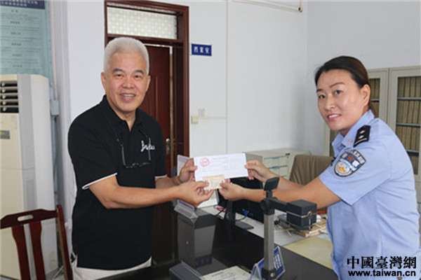 中國臺灣網9月7日安陽訊 《港澳臺居民居住證申領發放辦法》自9月1日起施行。9月5日上午,安陽市臺商投資企業協會籌備委員會主任、河南筷樂商貿有限公司總經理廖振勇先生在河南省安陽市臺辦工作人員的陪同下,到安陽市公安局北辰派出所戶籍室申請辦理臺灣居民居住證。這是安陽市受理的首張臺灣居民居住證申請。