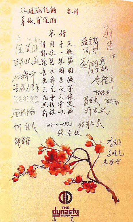 這份菜單十分“別致”——中間文字部分是四個字的“菜名”,上方可見主賓信息,下方有日期落款“27-4-1993”,左右兩側有許多賓客的簽名。