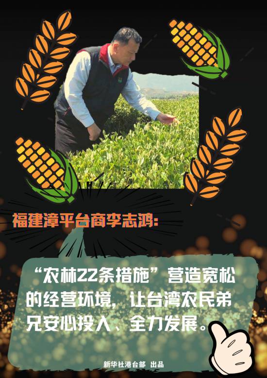 大陸又推出惠臺利民新“政策包”!《關(guān)于支持臺灣同胞臺資企業(yè)在大陸農(nóng)業(yè)林業(yè)領(lǐng)域發(fā)展的若干措施》,簡稱“農(nóng)林22條措施”,17日一經(jīng)公布即受到臺胞臺企點贊嘉許。他們充分肯定措施接地氣、有針對性,涵蓋面廣,支持力度大,為臺胞臺企參與大陸農(nóng)業(yè)林業(yè)高質(zhì)量發(fā)展及鄉(xiāng)村振興創(chuàng)造更好條件、提供更多機遇。