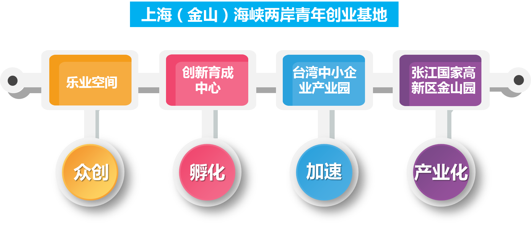 上海(金山)海峽兩岸青年創(chuàng)業(yè)基地是國務(wù)院臺辦于2015年10月設(shè)立的上海首個海峽兩岸青年創(chuàng)業(yè)基地,由樂業(yè)空間、創(chuàng)新育成中心、臺灣中小企業(yè)產(chǎn)業(yè)園、張江國家高新區(qū)金山園等四塊主要承載地組成,分別承載“眾創(chuàng)、孵化、加速、產(chǎn)業(yè)化”功能,打造“兩岸合作+公辦公益、政府支持+社會參與、眾創(chuàng)孵化+加速產(chǎn)業(yè)化、基地+基金”的全要素、全產(chǎn)業(yè)鏈的兩岸青年創(chuàng)新創(chuàng)業(yè)基地。截至目前,基地已有45個創(chuàng)新創(chuàng)業(yè)項目(其中臺資項目13個)注冊落戶,總注冊資本2.5億元人民幣、4300萬美元。