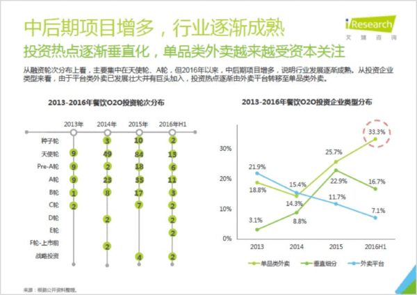 外賣O2O依然處于井噴階段,用戶的消費能力增加也導致了其從價格敏感轉向了品質(zhì)敏感,也在反過來倒逼整個外賣行業(yè)的質(zhì)量提升,安全、餐飲品類、物流等等通通需要全面的提升,單品和垂直類外賣之所以在后期受到投資青睞正是因為其能夠更為專注的做到從安全到物流的各項品質(zhì)服務,而其服務的用戶也偏中高端,有著更高的消費能力與黏性,可以最早實現(xiàn)盈利,繼而成為投資的新寵。