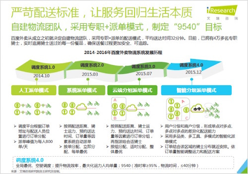 以百度外賣為例,其背后有著百度強大的人工智能調(diào)度作為支撐,因此在外賣方面也是在一開始就建立了以大數(shù)據(jù)人工智能挖掘作為基礎的配送,其在2014年上線之初就采用派單模式,其從第一階段為較為簡單的人工派單形式,進化到了第四階段開始對商戶進行更精確的分級、并采用多品類、多工具、多模式的智能化派單模式,其中展示了大數(shù)據(jù)技術的進化,最終達到了準時率98.78%,平均物流時間小于32分鐘的成績。