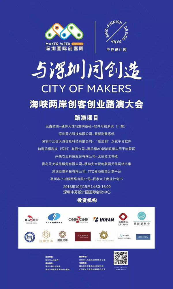 2016年10月14日15:00-15:30,第二屆深圳國際創客周海峽兩岸青年創業主題活動啟動儀式。此次啟動儀式正式拉開全國海峽兩岸青年創業主題活動帷幕,國家部委、省、市等各級領導及嘉賓蒞臨現場,其中海協會會長陳德銘、深圳市委常委、統戰部部長林潔也將參與啟動并致辭。啟動儀式中,中芬設計園將與臺灣興聯農業科技股份有限公司簽約,開啟深層次的合作和發展模式,并舉行深臺智能建筑創新中心,以及聯想加速器戰略合作示范基地的掛牌儀式,作為中芬設計園在兩岸創新創業上的全新孵化成果。充分展示全國各個海峽兩岸青年創業基地及示范點在推動大眾創業萬眾創新及孵化培育優秀創客創業項目上做出的努力,為臺灣青年來大陸發展提供良好的土壤,為促進更多兩岸優質創新創業成果落地助力。