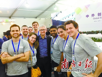在10月12日下午召開的中外創(chuàng)客領袖座談會上,來自HAX孵化器的約10名國際創(chuàng)客在座談會上分享最新成果,暢談發(fā)展理念。在會議間隙,這些國際創(chuàng)客還“逮”住蘋果公司CEO蒂姆·庫克合影。