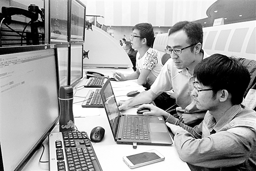 晁京(中)和同事探討信息平臺建設課題。經濟日報記者 李治國攝