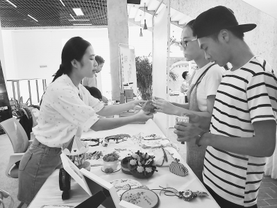 圖為手工坊的創客帶來了精美的手工作品,兩位年輕人饒有興致地駐足欣賞