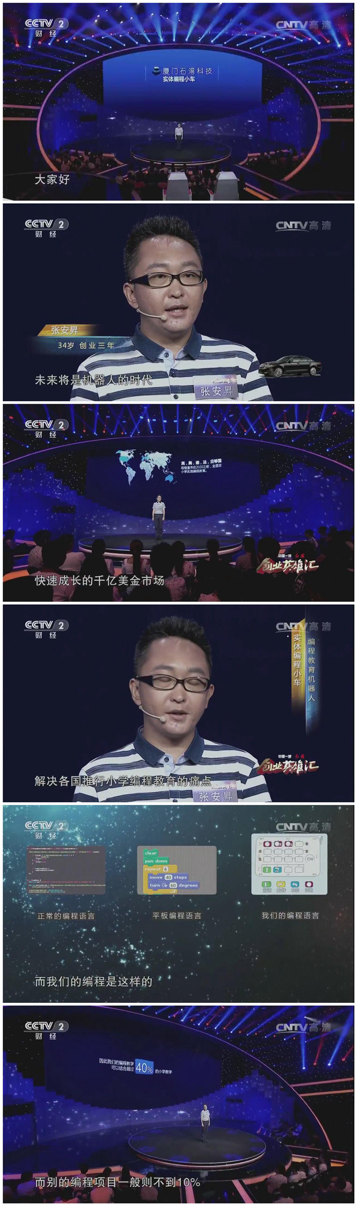 7月22日晚,CCTV2央視財經頻道大型勵志類創業節目——《創業英雄匯》,又迎來了三位創業者。一品創客·海峽兩岸無人機暨智能機器人孵化基地的孵化項目——實體編程小車(廈門石灣科技)走上了《創業英雄匯》的舞臺。
