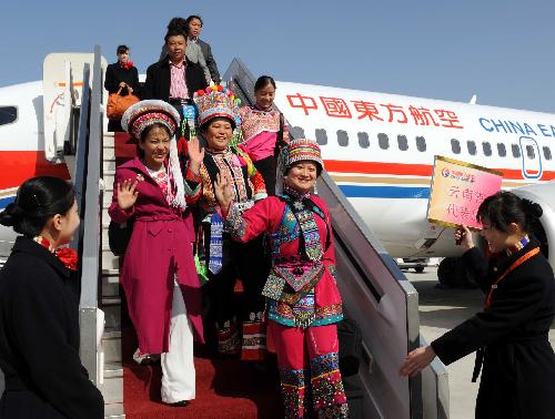 Deputies to the Third Session of the 11th National People's Congress (NPC) from southwest China's Yunnan Province arrive in Beijing, capital of China, March 2, 2010. The Third Session of the 11th NPC is scheduled to open on March 5. (Xinhua/Yang Zongyou)