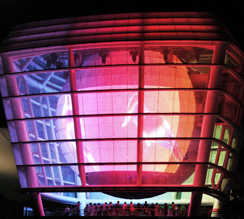 Tourists visit the sky lantern-shaped Taiwan Pavilion at the Shanghai Expo Site, August 10, 2010. The Taiwan Pavilion celebrated its 400,000th visitor on Tuesday. Most of the visitors have flown electronic sky lanterns, known as Kongming Lanterns in China, which are used to make wishes and pray for safety and happiness during festivals and celebrations in Taiwan. [Photo/Xinhua] |