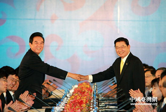 Chairman of the mailand's Association for Relations Across the Taiwan Straits (ARATS) Chen Yunlin (L) shakes hands with Taiwan's Straits Exchange Foundation (SEF) Chairman P.K. Chiang during a cross-Straits meeting in Taipei December 21, 2010. Taiwan and the mainland are planning to sign a medical agreement to share information on epidemics and cooperate in developing new drugs. (Photo: ChinaTaiwan)