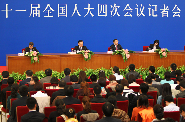Chinese Foreign Minister Yang Jiechi (2nd R, Top) answers questions during a news conference on the sidelines of the Fourth Session of the 11th National People's Congress (NPC) at the Great Hall of the People in Beijing, China, March 7, 2011. (Xinhua/Chen Jianli)