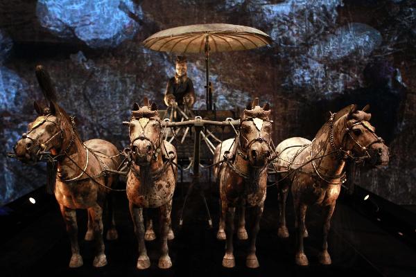 National treasure No. 1 bronze chariots and horses from northwest China's Shaanxi Province Museum of the Terra-cotta Warriors and Horses of Qinshihuang is presented in the China Pavilion in the World Expo in Shanghai, east China, on June 1, 2010. It is the first time for the No. 1 bronze chariots and horses to be presented outside Shaanxi after it was unearthed 30 years ago. (Xinhua/Ren Long)