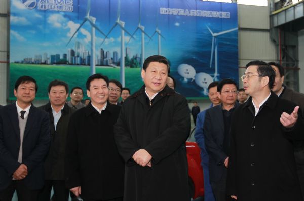 Chinese Vice President Xi Jinping (2nd R front), also a member of the Standing Committee of the Political Bureau of the Communist Party of China (CPC) Central Committee, inspects the Xiangtan Electric Manufacturing Co., Ltd. in Xiangtan, central China's Hunan Province, March 21, 2011. Xi Jinping made an inspection tour in Hunan from March 20 to 23. (Xinhua/Ju Peng)
