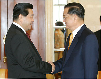 Jia Qinglin (L), chairman of the National Committee of the Chinese People's Political Consultative Conference, shakes hands with Lien Chan, honorary chairman of the Chinese Kuomintang (KMT) party, during their meeting in Beijing April 14, 2006. [Xinhua Photo] |