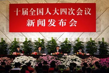 A press conference on the Fourth Session of the 10th National People's Congress (NPC) is held at the Great Hall of the People in Beijing on March 4, 2006. The Fourth Session of the 10th National People's Congress will start on March 5. [Xinhua Photo]