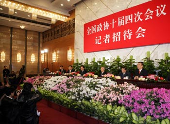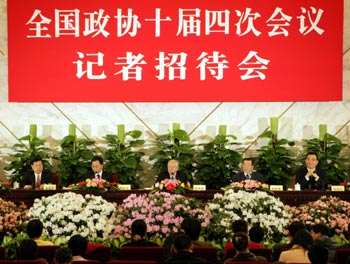 A press conference on the 11th Five-Year Plan for National Economic and Social Development is held by the Tenth National Committee of the Chinese People's Political Consultative Conference (CPPCC) in Beijing March 7, 2006. Wu Jinglian, Lin Yifu, Qiu Xiaohua, Zhao Zhongxian and Lu Zhiqiang, members of the CPPCC National Committee were invited to the press conference. [Xinhua Photo]