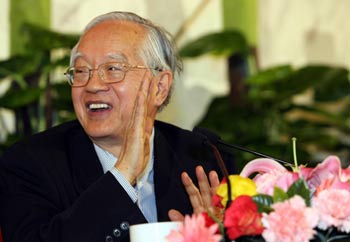 Renowned economist Wu Jinglian, also member of the Tenth National Committee of the Chinese People's Political Consultative Conference (CPPCC), gestures during a press conference on the 11th Five-Year Plan for National Economic and Social Development held by the CPPCC National Committee in Beijing March 7, 2006. [Xinhua Photo]