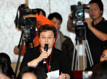 A foreign journalist raises questions during a press conference on the 11th Five-Year Plan for National Economic and Social Development held by the Tenth National Committee of the Chinese People's Political Consultative Conference (CPPCC) in Beijing March 7, 2006. [Xinhua Photo]
