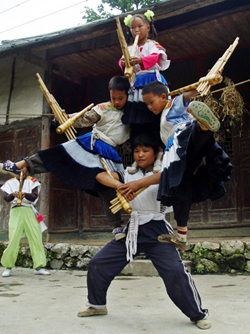 Undated file photo shows children performing lusheng (reed pipe) dance in Nayong, southwest China's Guizhou Province. A total of 31 art forms of Guizhou Province have been included in China's Intangible Cultural heritage List, which has 518 items. [Xinhua Photo]