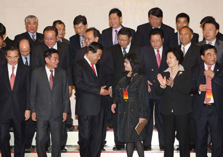 Jia Qinglin (C), member of the Standing Committee of the Political Bureau of the Communist Party of China Central Committee, who is also chairman of the National Committee of the Chinese People's Political Consultative Conference, meets with trade union representatives from Taiwan Province in Beijing, Nov. 3, 2009. (Xinhua/Liu Weibing)
