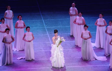 Song Zuying (C), a well-known singer of Chinese folk songs, sings a song of the musical "Road to Revival" at the Great Hall of the People in Beijing, capital of China, on Sept. 20, 2009. The grand musical made its debut here on Sunday night to mark the 60th anniversary of the founding of the People's Republic of China. (Xinhua/Chen Shugen)