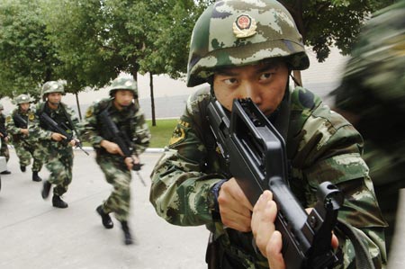 Chinese armed policemen practise during an anti-terrorism training to ensure the stability during the National Day holidays, in Hefei, capital of east China's Anhui Province, Sept. 25, 2009. (Xinhua/Li Jian)