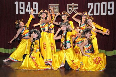 Teachers of a eastern language school perform during a celebration to mark the upcoming 60th anniversary of the founding of the People's Republic of China, in Yangon, Myanmar, Sept. 26, 2009. (Xinhua/Zhang Yunfei)