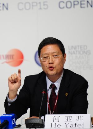 China's Vice Foreign Minister He Yafei addresses a press conference during the high-level segment of the United Nations Framework Climate Change Conference in Copenhagen, capital of Denmark, Dec. 17, 2009. (Xinhua/Zeng Yi)