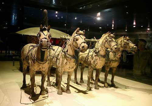 The first bronze chariot is two-wheeled and drawn by four horses. It weighs a total of 1,061 kilograms including the solider in charge of the chariots and the canopy.