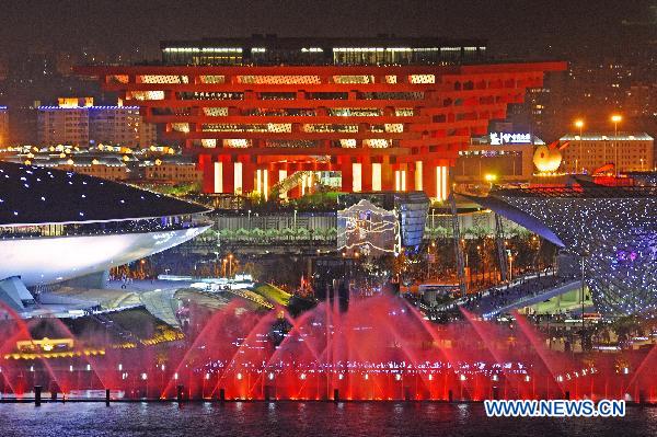 Photo taken on Aug. 7 shows the music fountain in the World Expo Park in Shanghai, east China, Aug. 7, 2010. Shanghai Expo witnessed the 100th Day on Sunday. During the past three months, more than 38 million people visited the World Expo Park and some 10 thousand performances have been carried out. (Xinhua/Guo Changyao)