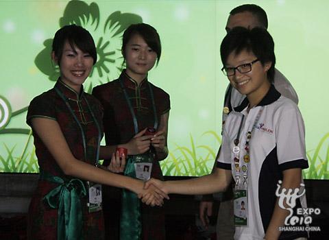 Staff members of the USA Pavilion and China's Joint Provincial Pavilion exchange gifts.