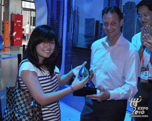 A visitor from Jiangsu Province wins a crystal and a VIP pass to the China Pavilion and the Netherlands Pavilion as the 500,000th visitor to the Rotterdam Pavilion in the Urban Best Practices Area.