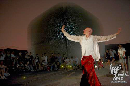 In this file photo, British artist Alan Grieg performs at the UK Pavilion July 6. [expo2010.cn]
