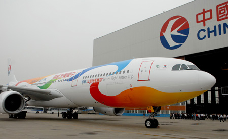Photo taken on Oct. 12, 2009 shows the florid drawing plane Volunteer of World Expo 2010 during an unveiling ceremony to mark the 200-day countdown to the World Expo 2010, on the tarmac of Hongqiao Airport, in Shanghai, east China. This is the 3rd of the 6 florid drawing planes provided by the China Eastern Airlines Corporation Ltd to the World Expo. (Xinhua/Huang Guoqing)
