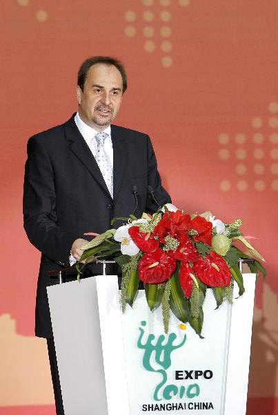 Jan Kohout, deputy prime minister and minister of Foreign Affairs of the Czech Republic, addresses a ceremony marking the National Pavilion Day for the Czech Republic at the World Expo park in Shanghai, May 17, 2010. (Xinhua/Liu Ying)
