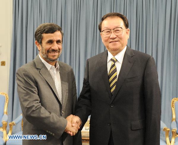 Li Changchun (R), a member of the Standing Committee of the Political Bureau of the Central Committee of the Communist Party of China, meets with Iranian President Mahmoud Ahmedinejad in Tehran, capital of Iran, Sept. 28, 2010. (Xinhua/Ma Zhancheng)