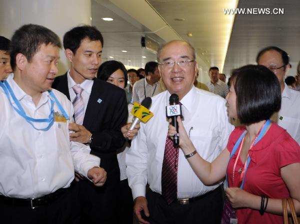 Kuomintang(KMT) Honorary Chairman Wu Poh-hsiung (C) arrives for the sixth Cross-Strait Economic, Trade and Culture Forum, in Guagnzhou, south China's Guangdong Province, July 9, 2010. (Xinhua/Guo Lei)