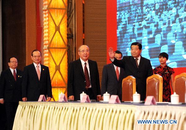 Jia Qinglin (R, front), member of the Standing Committee of the Political Bureau of the Communist Party of China (CPC) Central Committee, and Kuomintang (KMT) honorary chairman Wu Poh-hsiung (3rd L), attend the conclusion ceremony of the Cross-Strait Economic, Trade and Culture Forum, a regular forum between the Chinese mainland and Taiwan, in Chengdu, capital of southwest China's Sichuan Province, May 8, 2011. (Xinhua/Rao Aimin)