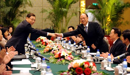 Zheng Lizhong (R), standing vice president of the Chinese mainland's Association for Relations Across the Taiwan Straits (ARATS), shakes hands with Kao Kung-lian, vice chairman and secretary-general of Taiwan-based Straits Exchange Foundation (SEF) at a preparatory discussion in Fuzhou, capital of southeast China's Fujian Province, Dec. 10, 2009. The preparatory discussion was held to decide the schedule for an upcoming cross-strait talks.(Xinhua/Zhang Guojun)