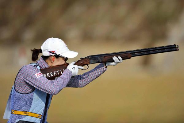 Zhang Shan of China shoots during the competition of Women's Skeet Team of shooting at the 16th Asian Games in Guangzhou, south China's Guangdong Province, Nov. 23, 2010. The team of China claimed the title. (Xinhua/Chen Yehua)