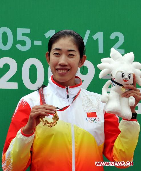 File photo taken on Dec. 12, 2009 shows Jin Ziwei celebrating on the awarding ceremony of women's 1500m Double Sculls at the 5th East Asia Games. Jin, the gold medal winner in the Beijing Olympics, would act as the flag bearer of Chinese delegation in the opening ceremony of the 16th Asian Games in Guangzhou, China on Nov. 12, 2010. (Xinhua/Lo Ping Fai)