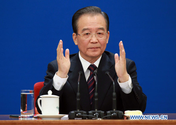 Chinese Premier Wen Jiabao gestures as he speaks during a press conference after the closing meeting of the Fourth Session of the 11th National People's Congress (NPC) at the Great Hall of the People in Beijing, China, March 14, 2011.(Xinhua/Pang Xinglei)
