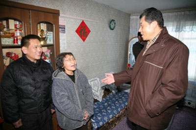 劉大使首先來到工人張純業家。他家年過七旬的母親知道劉大使要來拜年,早早就守候在巷口,翹首以待。劉大使走進貼上了大紅春聯的張純業家里,與他們母子倆親切交談,噓寒問暖。當得知張純業工作踏實認真,連續多年獲得“勞動模范”稱號時,劉大使特別高興并鼓勵他繼續努力;當得知已近不惑之年的張純業還未成家娶親時,劉大使囑咐華聯會和使館領事部多創造條件,幫助張純業早日成家,了卻老母親的心頭大事。一句話就說到了老人的心坎里,她對劉大使的親切關心表示感謝。她說,劉大使在春節前夕像親人般地看望他們母子倆,并帶來了慰問品,讓他們真切感受到祖國的溫暖。