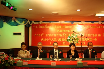 王應(yīng)邀出席洛坤府15僑團(tuán)國慶聯(lián)歡晚宴。洛坤府府尹、洛坤市市長、府警廳廳長及當(dāng)?shù)?5僑團(tuán)僑胞等400余人出席。副府尹在致辭中首先祝賀中華人民共和國成立61周年,并表示,新中國是年輕的,但中華大地歷史悠久,他欣賞中國古老絢麗的文化,同時(shí)感慨61年來中國的飛速發(fā)展和變遷,祝福中國日益繁榮昌盛,人民幸福安康。王在致辭中首先回顧了新中國成立以來的發(fā)展歷程,強(qiáng)調(diào)中國堅(jiān)持走和平發(fā)展道路;王還介紹了近年來中泰關(guān)系發(fā)展情況,并希望雙方以建交35周年為起點(diǎn),擴(kuò)大合作,共謀發(fā)展,共同創(chuàng)造更美好的未來。