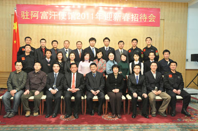 2011年1月21日晚,中國駐阿富汗使館內張燈結彩、歡樂喜慶。駐阿富汗大使鄭清典為全體在阿華人華僑和中資機構代表舉辦盛大的2011年春節招待會。中冶江銅、中鐵十四局、中興通訊、華為技術等中資機構代表、新華社、中央電視臺記者、旅阿華人華僑及使館全體人員歡聚一堂,喜迎農歷兔年新春。