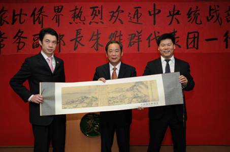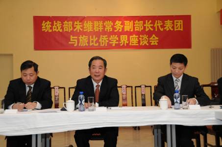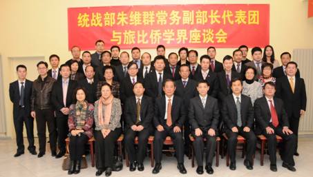 朱維群首先代表中央統戰部、中華海外聯誼會和中國和平統一促進會,以及全國政協副主席、中央統戰部部長杜青林,向旅比華僑華人長期以來關心支持祖國發展,為推動中國和平統一大業,為促進中比人民友誼所做出的貢獻表示感謝。