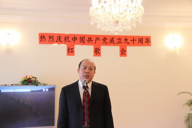 謝總領事在致辭中表示,今年是中國共產黨建黨九十周年,中國駐圣彼得堡總領館黨委今天在“紅五月”開始的第一天舉辦紅歌會,慶賀建黨九十周年,以此拉開駐圣彼得堡總領館慶祝建黨九十周年系列活動的序幕。謝總表示,紅歌是中國革命、建設和改革開放各個時期產生和流傳的紅色經典歌曲,是社會主義中國的時代主旋律。紅歌錄制美好的記憶,每當唱起這些曲調優美、語言精煉、內容向上的紅歌,就仿佛把我們帶到那烽火連天的戰爭時代,帶到那熱火朝天的建設工地,帶到那欣欣向榮、改革開放的城市和鄉村!紅歌引領正確的方向,每當唱起紅歌,我們就更加堅定共產主義理想和建設有中國特色社會主義的信念,使命感和責任感更強,艱苦奮斗、自強不息的自覺性更高!紅歌提振向上的士氣,每當唱起紅歌,我們就感到熱血沸騰、激情澎湃,為理想、為事業更加無所畏懼,精神狀態和革命斗志更加昂揚!紅歌凝聚人心,每當唱起紅歌,我們就更加團結奮進、萬眾一心,凝聚力和戰斗力更強!謝總指出,今年既是中國共產黨建黨九十周年,同時也是我國第十二個五年計劃的開局之年,以加快經濟發展方式、大力調整經濟結構和進一步改善民生為重點的各項改革和發展任務十分繁重和艱巨。與此同時,以服務國家主權、安全和發展利益為主要內容的新時期外交工作同樣任重道遠。新時期、新任務和新要求呼喚科學發展,創新發展,與時俱進,同時也呼喚繼承和發揚優良傳統、優良作風和優良精神。我們舉辦紅歌會,一方面是通過這些紅歌歌頌黨、歌頌祖國、歌頌人民和歌頌美好生活,慶祝和紀念中國共產黨建黨九十周年,另一方面,我們希望通過詠唱這些紅歌,重溫歌曲中洋溢的愛國主義、集體主義、革命英雄主義和樂觀主義精神,用紅歌中體現的優良傳統、優良作風和優良精神鼓舞和鞭策我們在新時期外交工作中創先爭優!