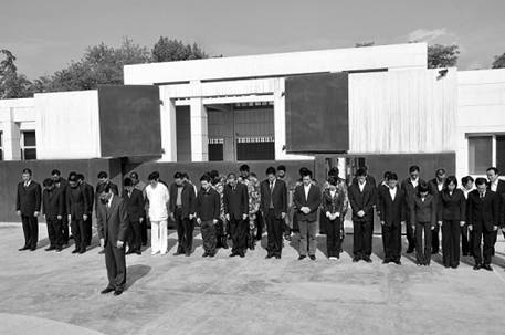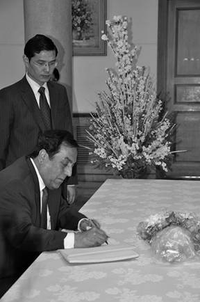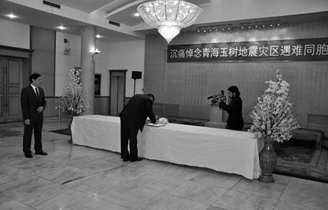 使館國(guó)旗徐徐降下,全體同志懷著無(wú)比悲痛的心情,肅立默哀三分鐘。隨后,在使館臨時(shí)布置的靈堂內(nèi),同志們面向懸掛著“沉痛悼念青海玉樹(shù)地震災(zāi)區(qū)遇難同胞”的挽幅三鞠躬,并依次在哀思簿上留言,向地震遇難同胞致以沉痛哀悼。